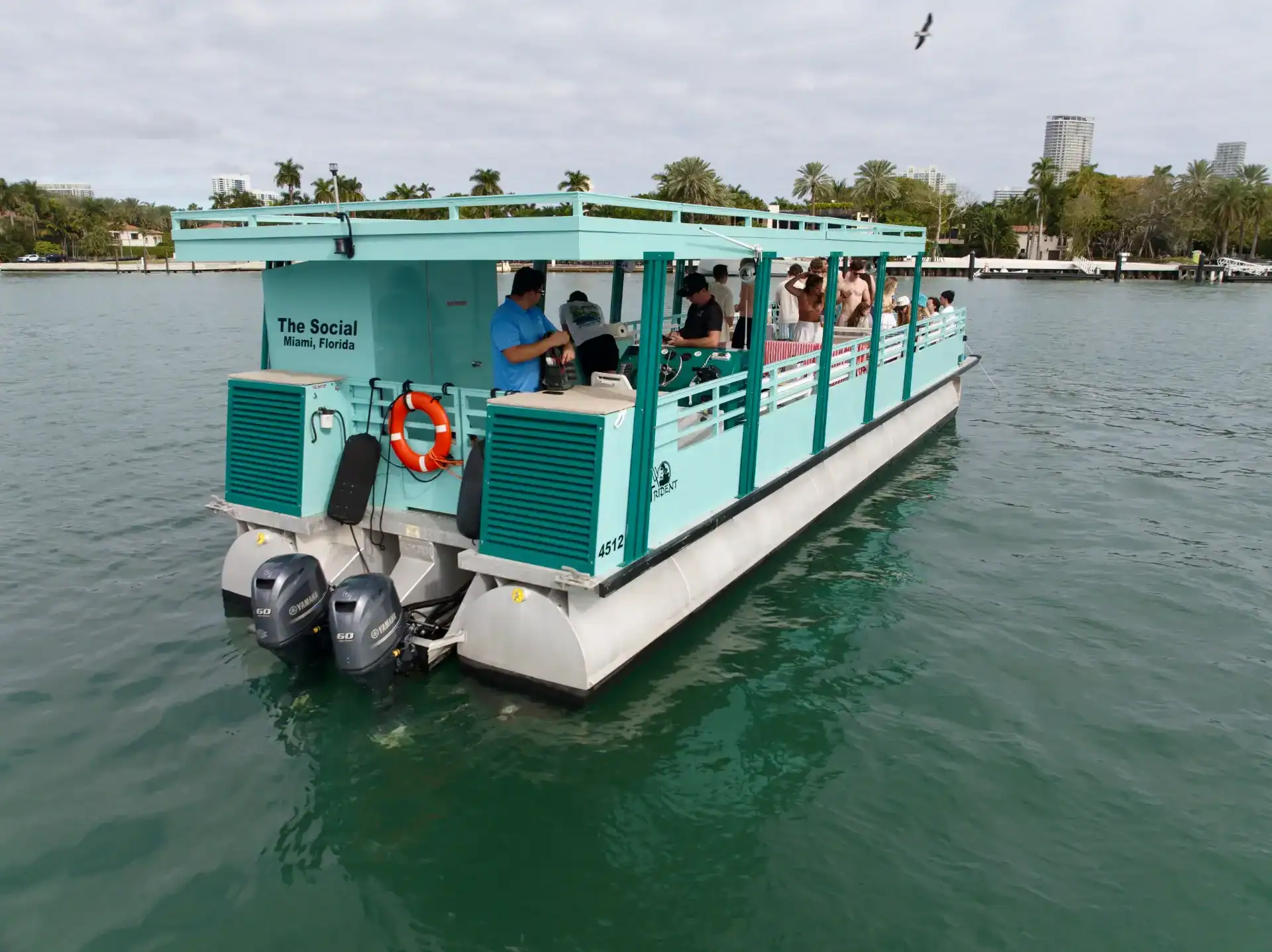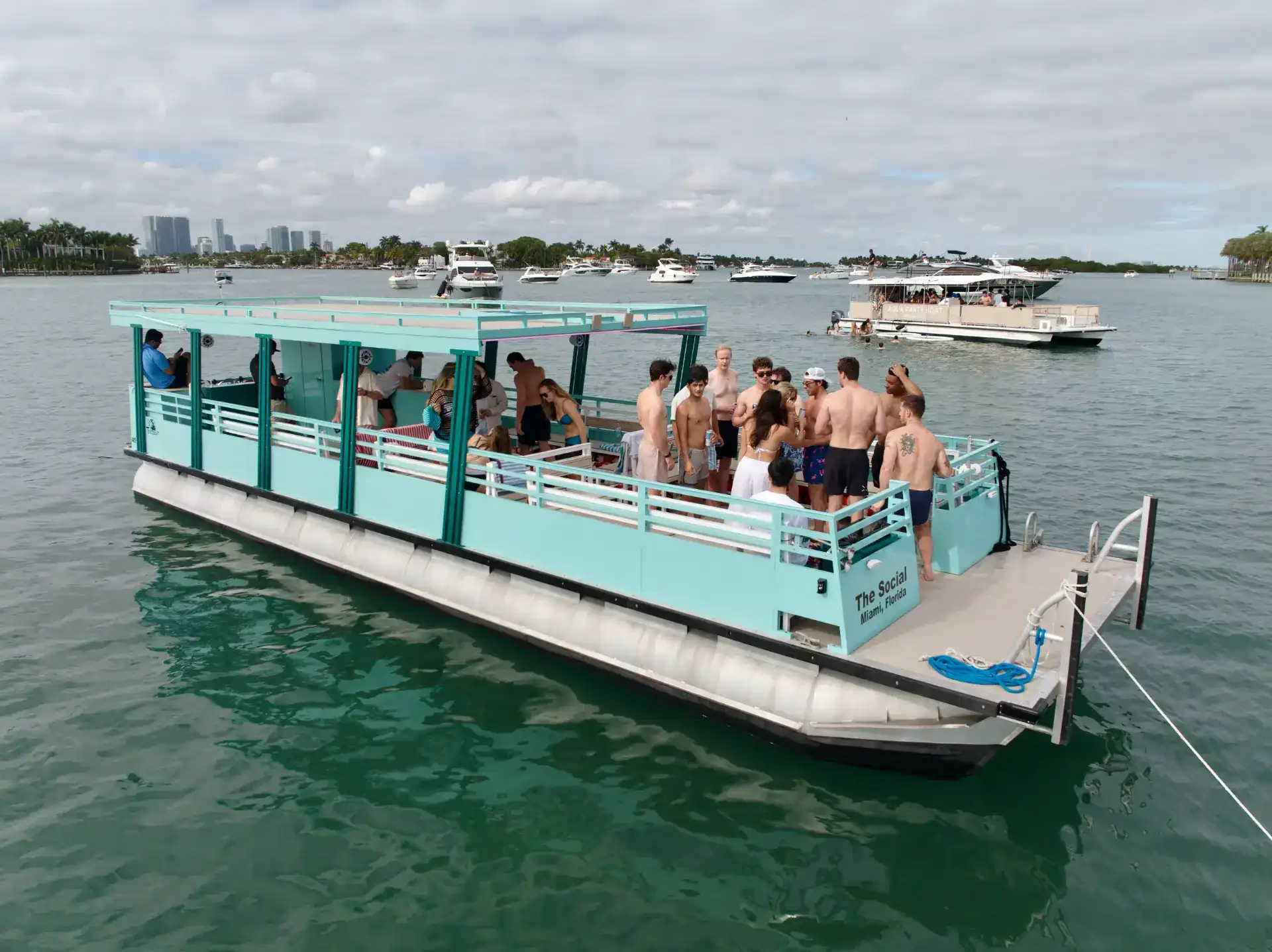 Our friendly and professional captain and crew are dedicated to ensuring you have the best time possible. With our large BT accessible speaker, you can dance, sing, and celebrate to your favorite tunes on this festive party boat in Miami. “The Social” is not just a pontoon party boat—it’s your ticket to creating lasting memories on the water. Book today and experience one of the top party boats in Miami for large groups!